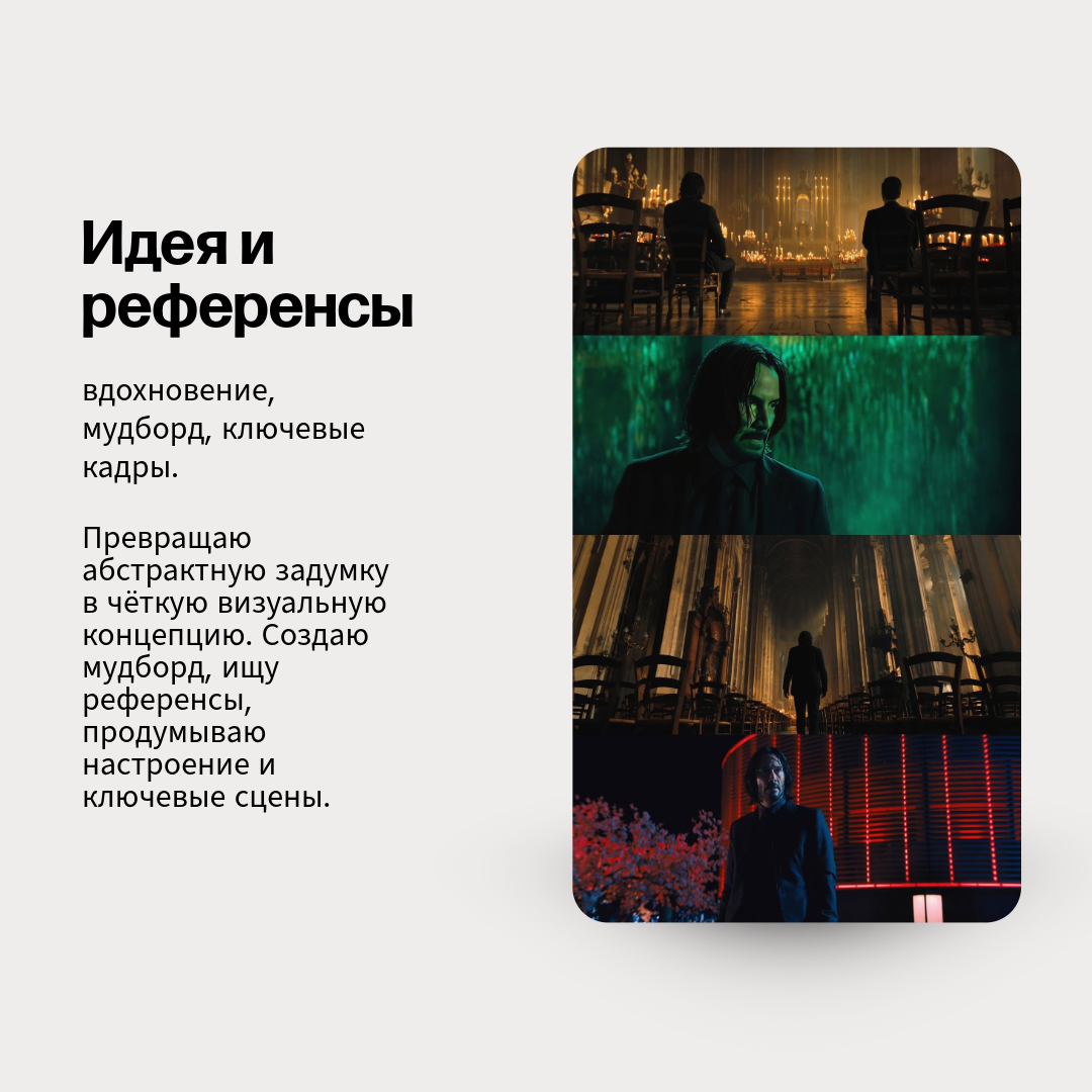 Идея и концепция: За годы работы в кино и рекламе я научился считывать эмоции и передавать их в кадре. Вместе с вами мы определяем стиль видео: лёгкая репортажная съёмка, динамичный клип или настоящий мини-фильм?