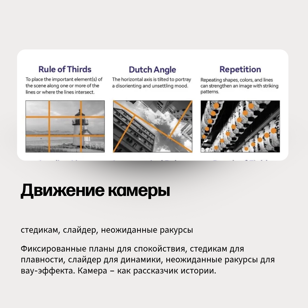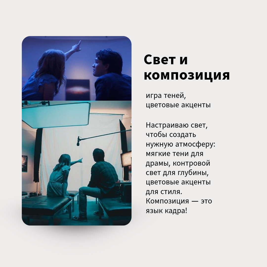 Движение камеры: Мой арсенал — это не просто камера. Я использую стедикам для плавных движений, дрон для масштабных планов, ручную камеру для передачи живых эмоций. Каждое движение — продуманный штрих в истории.