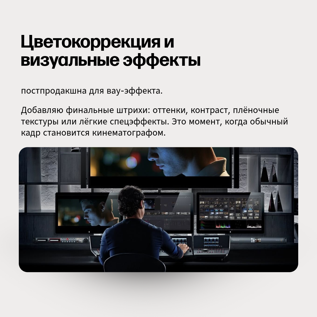 Монтаж и цветокор: Как человек, обработавший более 5000 треков и создавший сотни рекламных и художественных проектов, я знаю, как правильно подчеркнуть эмоции в монтаже. Цвет, ритм, звук — всё работает на впечатление.
