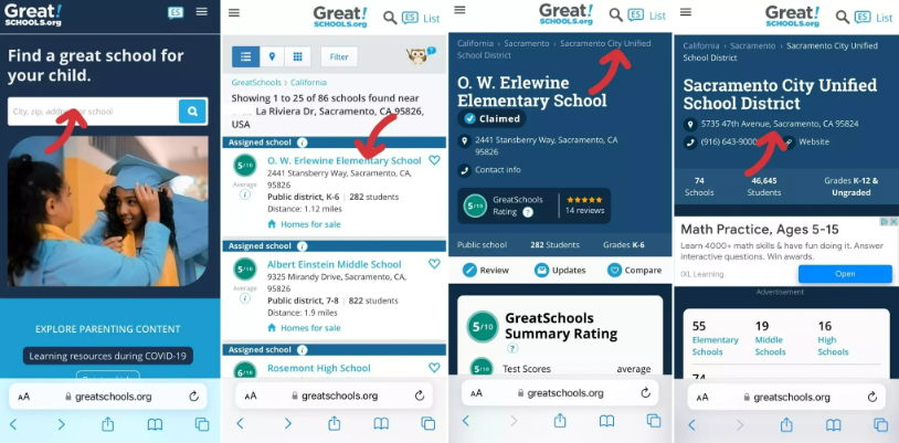 Для того чтобы подать документы, можно обратиться напрямую в учебное заведение или в офис school district. Его адрес можно найти также на сайте Great Schools, нажав на название школы и перейдя по ссылке сверху, как показано на скриншоте: