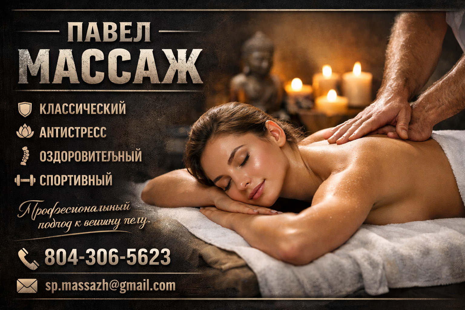 Профессиональный массаж для тех, кто ценит качество, результат и внимательное отношение к телу. Работаю с мышечным напряжением, болями в спине и шее, помогаю восстановиться после нагрузок и вернуть ощущение лёгкости и комфорта в теле.