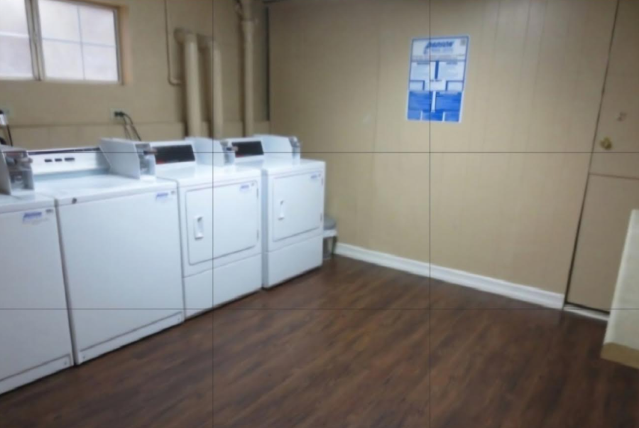 Granite countertops and granite floors. Regrigertor, the building has a shared laundry. 1-car gated parking space.