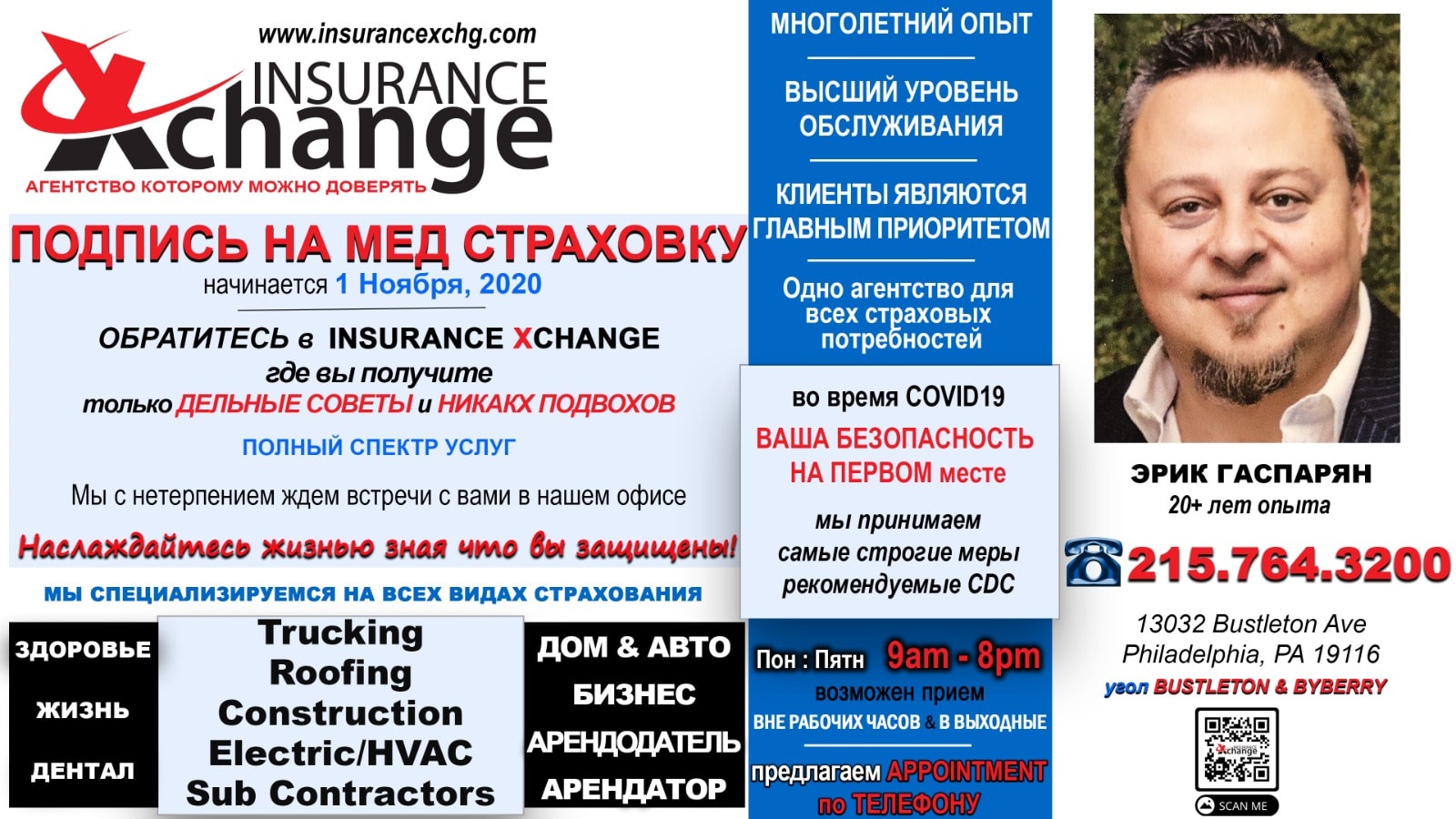 Страховое агентство специализирущееся на медицинском страховании, страховании машин и домов, страховках для бизнессов, инвесторов и многих других страхованиях. Имея опыт больше 20ти лет, мы предостовляем полый спектр услуг. Наш офис поможет подобрать самий лучший вариант. Наслаждайтесь жизнью зная что вы застрахованы! Страхование домов и машин, мотоциклов, трейлеров, страховка для бизнесса, медицинская страховка, страхование жизни. 215-764-3201 fax