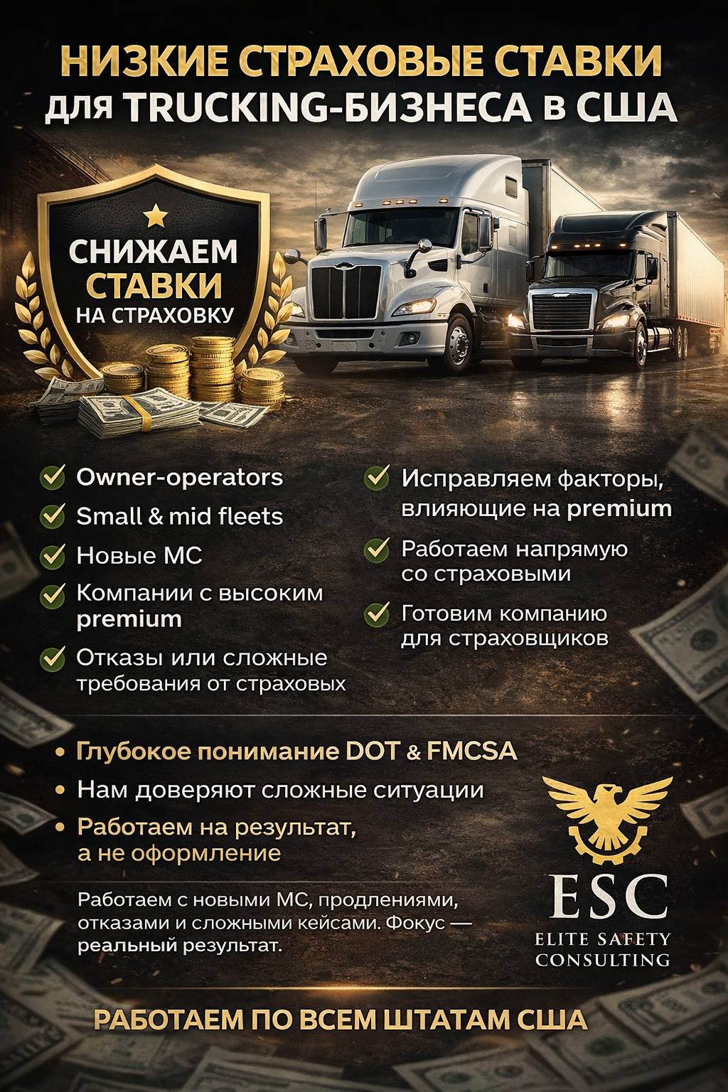 ELITE SAFETY CONSULTING — компания с более чем 8-летним опытом в сфере Safety & DOT Compliance для trucking бизнеса в США. Работаем напрямую с FMCSA, помогаем owner-operators, small fleets и новым компаниям проходить DOT и safety audit, улучшать CSA score, решать вопросы с нарушениями, DataQ и поддерживать бизнес в полном соответствии с требованиями DOT