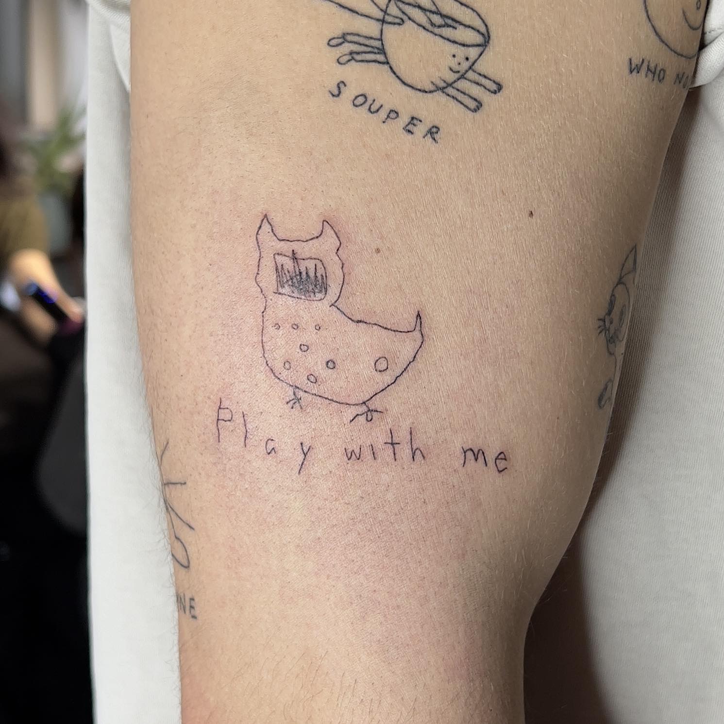 Татуировки с легкими, наивными эскизами, оторванными от серьезности, несут в себе дух бунтарства и свежести, при этом облегчая имидж. Мои работы представляют собой протест против системы, внося свободу и смелость в образ человека, освобожденного от ограничений.